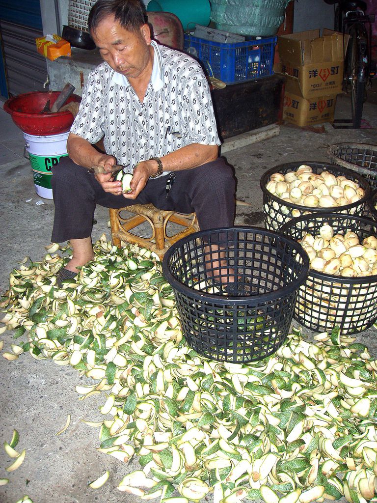 削皮後放在竹架上曬一天左右,覺得果實變軟,用手翻轉使果內的果實露出,再繼續曝曬三到六日或乾燥機烘乾,其曝曬時須瘦果朝下,凸皮朝上,直至瘦果基部充分乾燥,期間不可受雨水、露水浸潤。