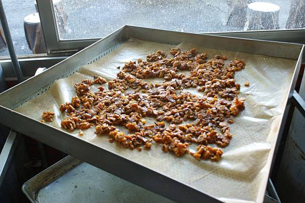 將加熱過後的芒果乾攤開在烤盤上面,曬乾等候接下來的步驟!