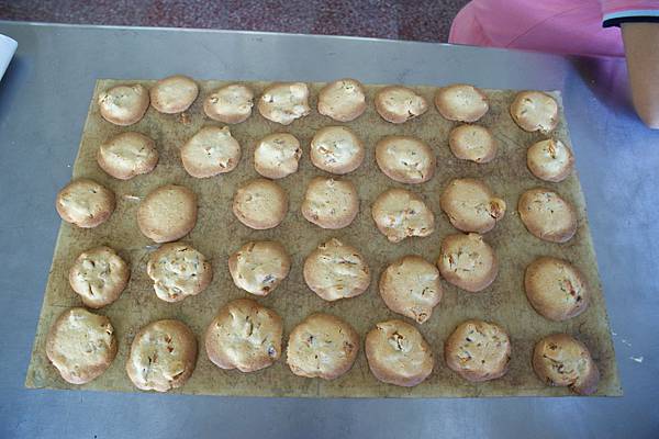 將完成品放入擠花袋內,慢慢的擠壓出來,擠完還要摔過才能變成扁扁的唷,在摔的時候不能太大力,若太扁的話周圍容易燒焦,但如果不夠,中心會比較不會熟!
