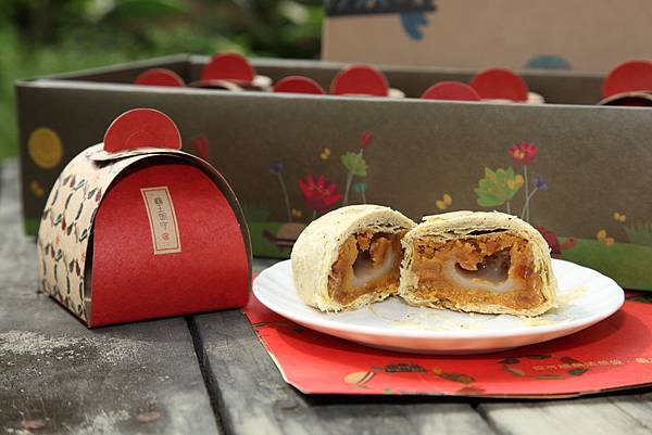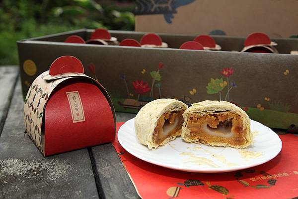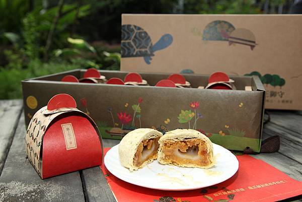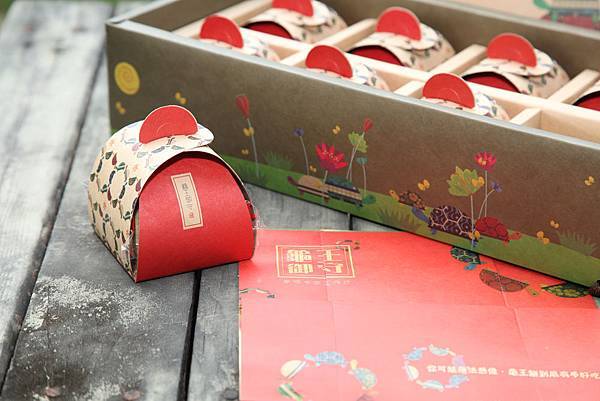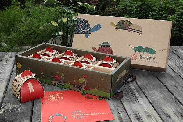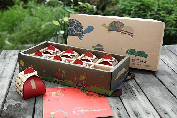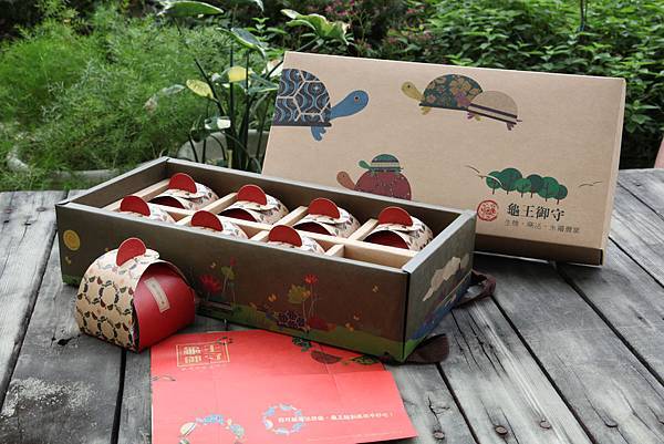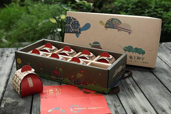 六龜大橋下原有的六隻烏龜天然造型岩石,在八八風災流離失所,僅剩龜王岩孤寂固守溪邊。而業者發揮創意與巧思,推出了包著6個龜王餅的「龜王御守」,代表著6隻烏龜團圓,祝福著平安的祈求、緣分的期待… 而龜王餅外皮加入了鮮磨的山茶粉,讓酥脆的外皮增添了淡淡茶香,而內餡中,搭配了烘焙過的芒果乾、客家QQ的麻糬與清爽的綠豆沙,口感層次豐富無可比擬,是來六龜必買的伴手禮之一。 |