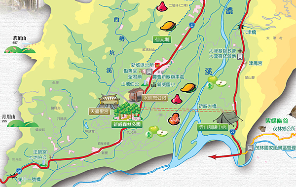 新威森林公園本為荖濃溪舊河床的一部份,後來因土質優良而建為苗圃,居民稱為「坪頂」。佔地30甲,以種植樹苗為主,培植的樣種多達 200餘種,為全台最大的苗圃之一。裡面樹林成蔭,春夏綠意盎然,其中以桃花心木、竹子、杉木最多。其中有一條桃花心木大道,周邊綠樹成陰,冬末初春時,桃花心木的綠葉會呈現紅黃色,加上鋪滿小徑的落葉,景色顯得詩情畫意,有著異國風情,常吸引許多情侶前來散步,也是許多新人拍攝婚紗指定的地點。